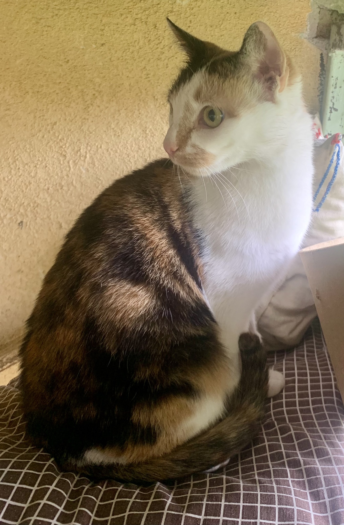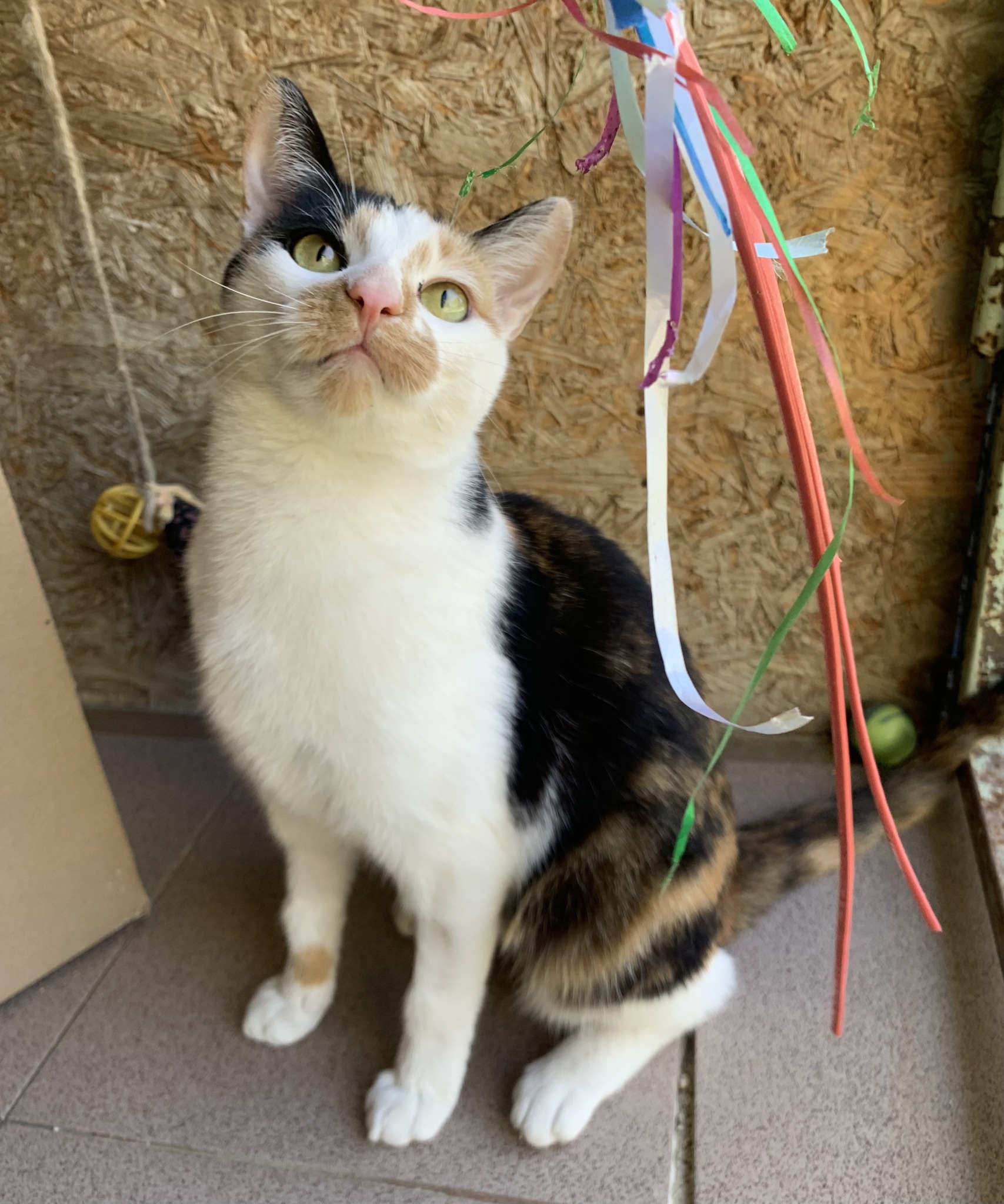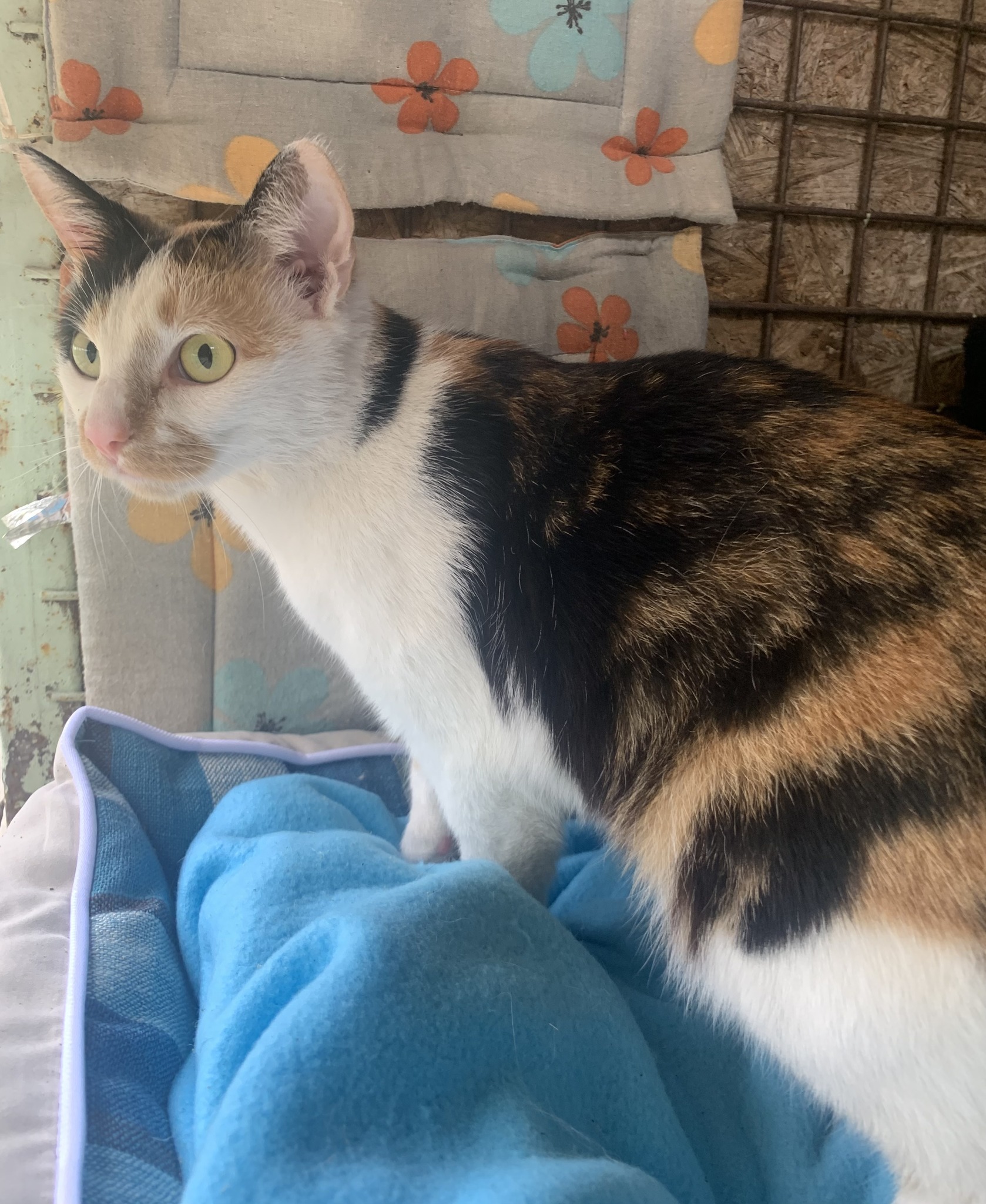 Nagyon szép kis trikolor fiatal cica, ivartalanított, negatív Felv-Fiv tesztes, oltott, parazitamentes, a volt gazdijának sajnos költözés miatt kellett megválnia tőle, így a családtagjai befogadták Gombócot egy kis időre, de sajnos az Ő kutyusukkal és a kandúr cicájukkal nem sikerült megbarátkoznia a cicahölgynek ezért került végül hozzánk.