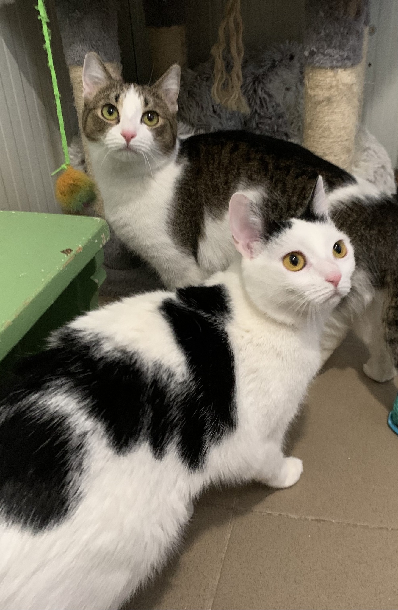 Benti cicák voltak eddig is, ezután is egy biztonságos, meleg otthonba vágynak, szerető simogató kezekre. Szépen használják az almot, a cicabútorokat, a kaparófát, mindent tudnak amit egy szobacicának kell, imádnivaló páros.